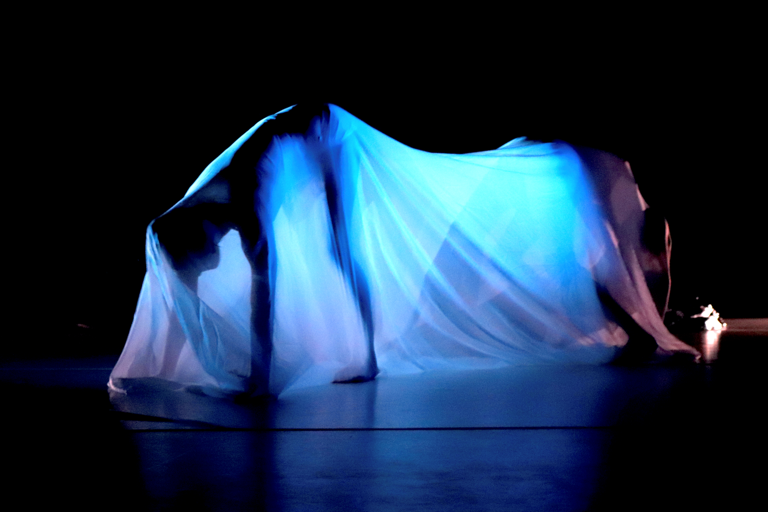 - 2e étude sur le textile et corps. Toujours ponctuée de lumière autant pour déposer une ambiance de mystère, autant pour faire percevoir cette créature en nous qui se cache.